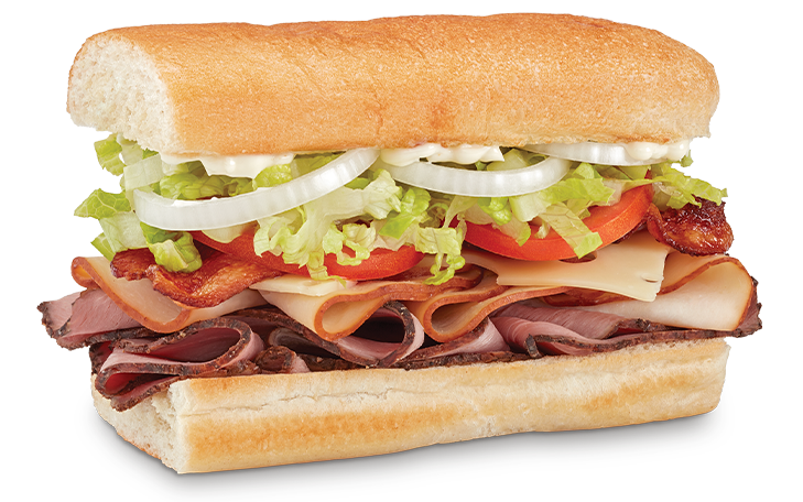 Roast beef, turkey, bacon, swiss, tomatoes, lettuce, onions & mayo